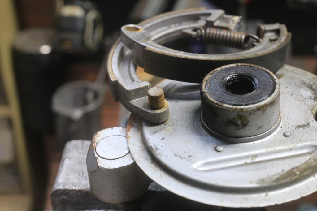古いブレーキシューはシューを固定している接着剤の劣化で剥がれてしまう事もあるので要交換。