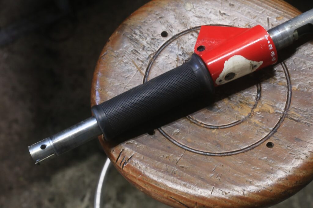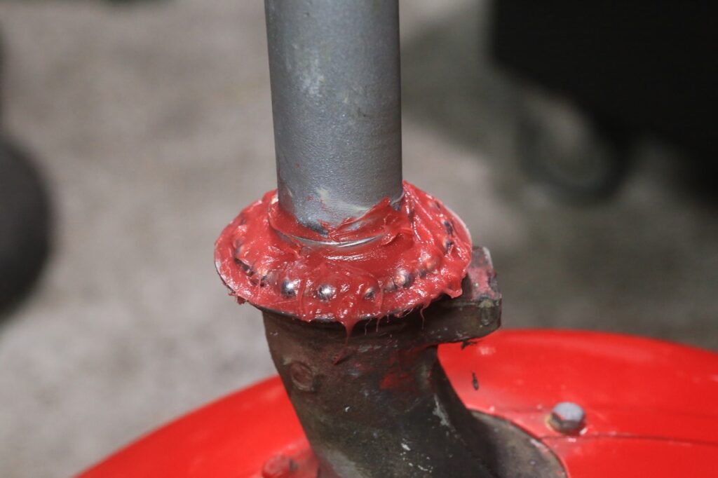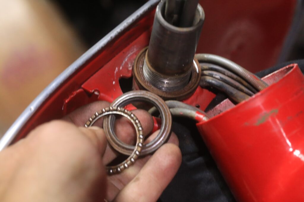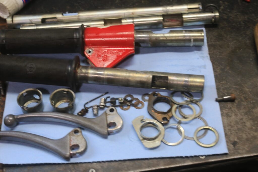 ピンボケだけど、ハンドルパイプを分解、洗浄、グリスを塗って組み直す作業。