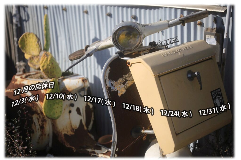 12月の店休日 11月 30, 2025 最終更新日時 : 12月 15, 2025 K.B.SCOOTERS 12月の店休日 12/3(水) 12/10(水) 12/17(水) 12/18(木) 12/24(木) 12/31(水)