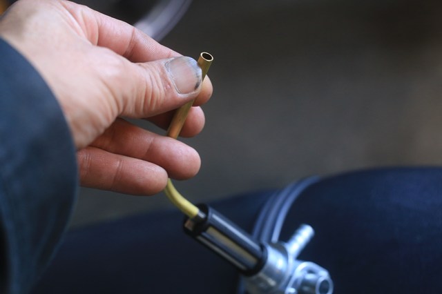 長い真鍮のパイプの上までガソリンを入れていると、いくらコックをオフにしても、パイプの上面より下に油面が来るまでガソリンはオンの状態になってしまいます。