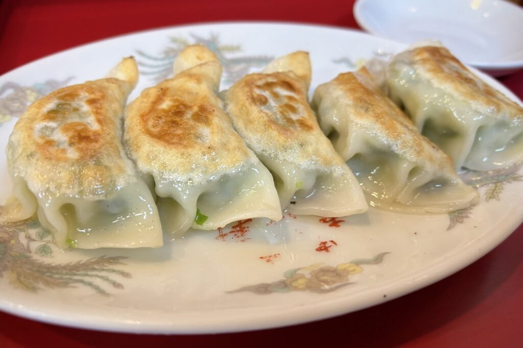 ひだは少なめ、ちょっと丸い形状の餃子で、ニンニクとニラが効いた味付けで皮もモチモチしていて自分好みな餃子でした。