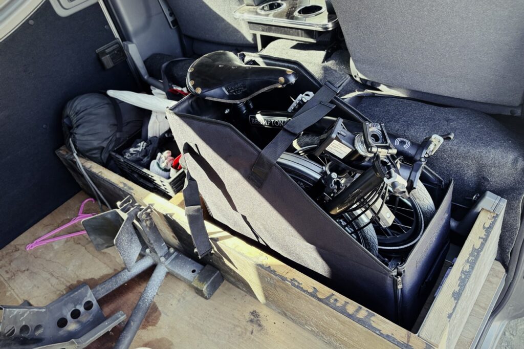 折りたたんだブロンプトンを収納するケースが、まさかな感じで荷室に設置してある棚?にピッタリ収まりテンションが上がる。