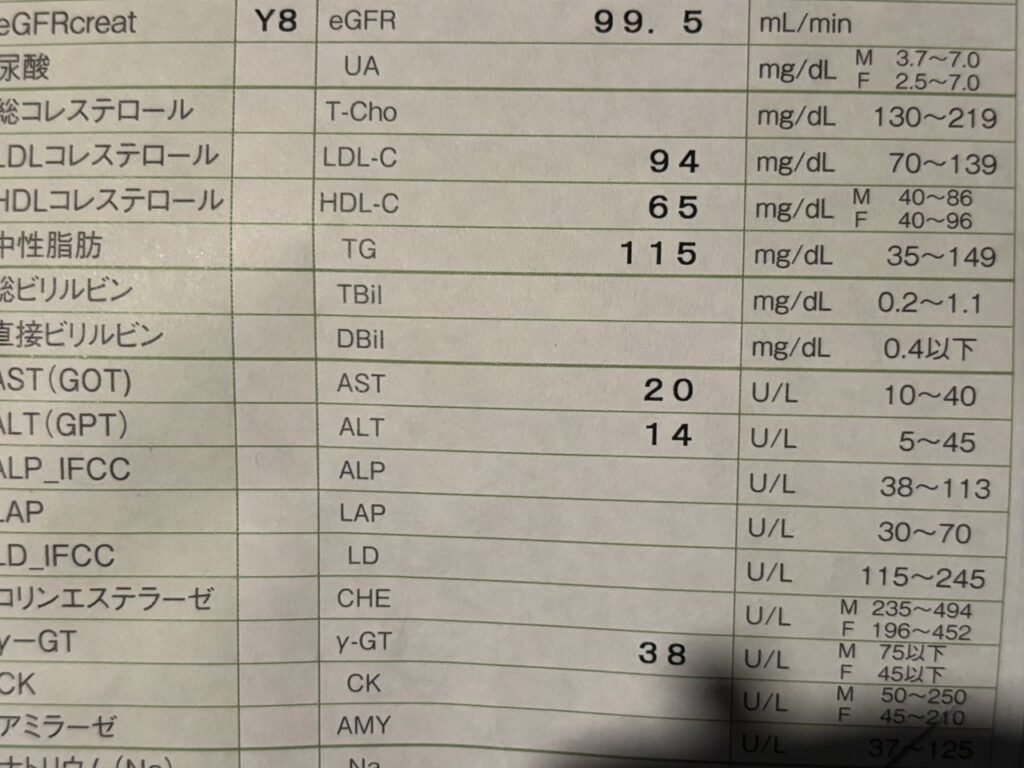 肝臓系、尿酸値、血糖値、全てOK。