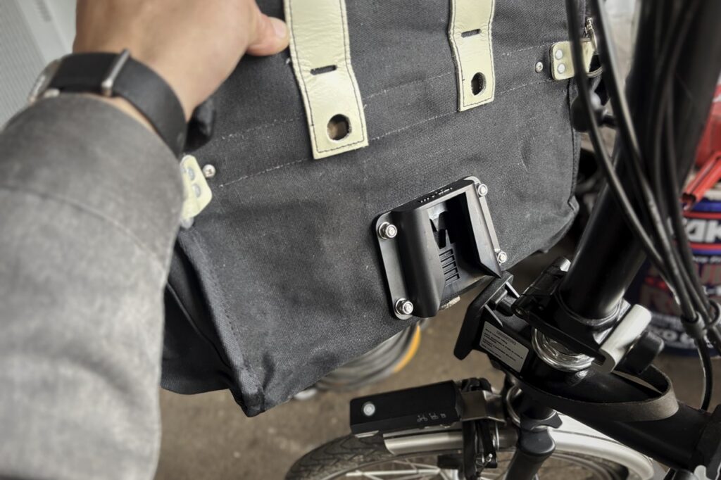 自転車には、バッグにこんな金具を取り付けて(内側には補強のプレート入れてあります)