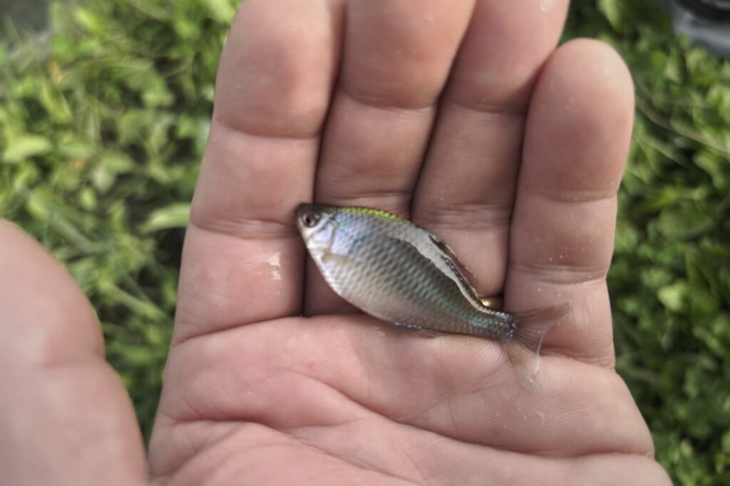 今日釣ったポイントは、極小サイズのクチボソが群れていたようで、アタリは絶えずあるんだけど中々釣れない。