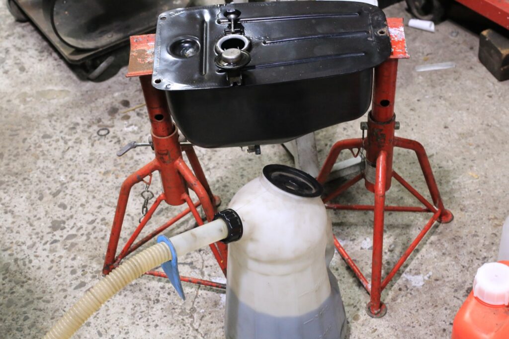 P200Eのフューエルタンクは内部で薄っすらとガソリンが結晶のような感じになって固まっているので、それを溶かす作業。