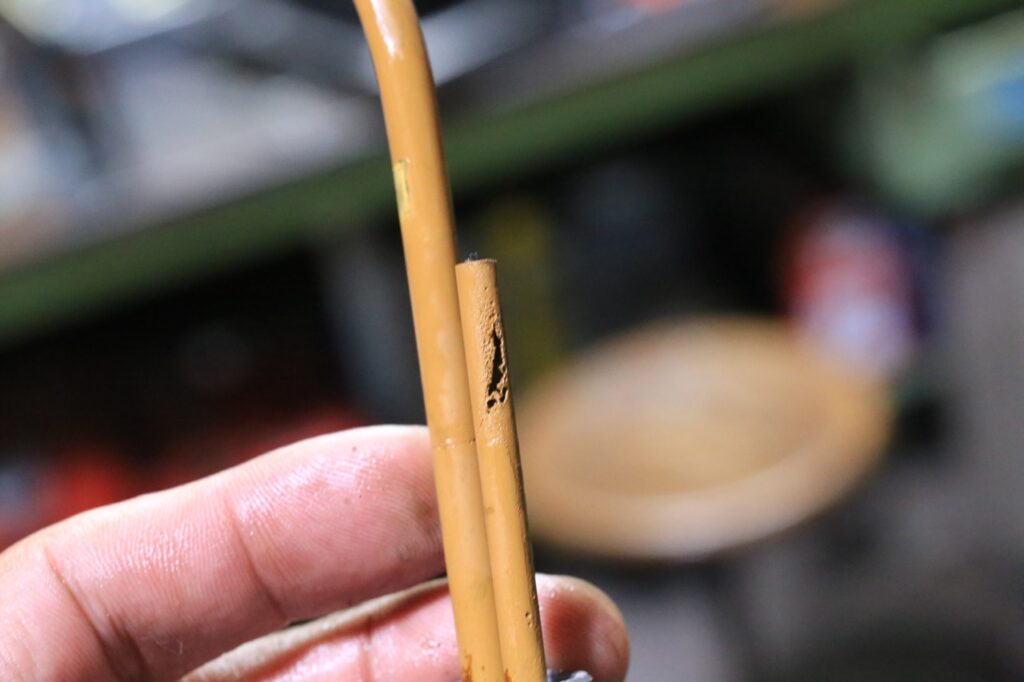 真鍮パイプが腐食して穴が開いていました。